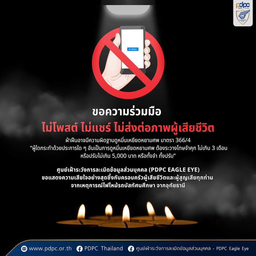 เหตุการณ์ไฟไหม้รถบัส อย่าแชร์รูปผู้เสียชีวิต เสี่ยงติดคุก และโดนปรับได้ โดย ศูนย์เฝ้าระวังการละเมิดข้อมูลส่วนบุคคล ประกาศ ขอความร่วมมือ ไม่โพสต์ ไม่แชร์ ไม่ส่งต่อภาพผู้เสียชีวิต หากฝ่าฝืนอาจมีความผิดฐานดูหมื่นเหยียดหยามศพ มาตรา 366/4