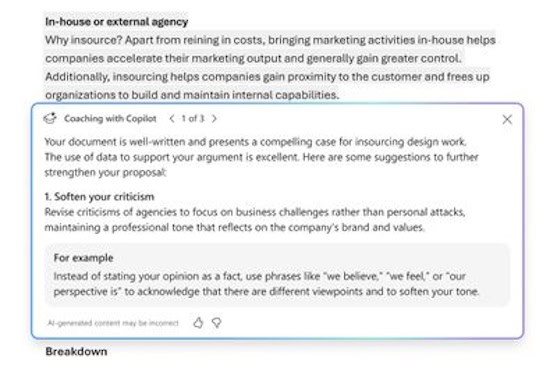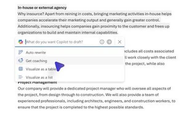 - เปิดเครื่องมือ: คลิกไอคอน Copilot แล้วเลือก “Get Coaching” หรือใช้ปุ่ม Shift+ลูกศรในการเลือกบางส่วน หรือ Ctrl+Shift+ลูกศร ในการเลือกทั้งย่อหน้า แล้วกด Alt+i เพื่อเปิดหน้าต่าง Copilot และเลือก “Get Coaching”