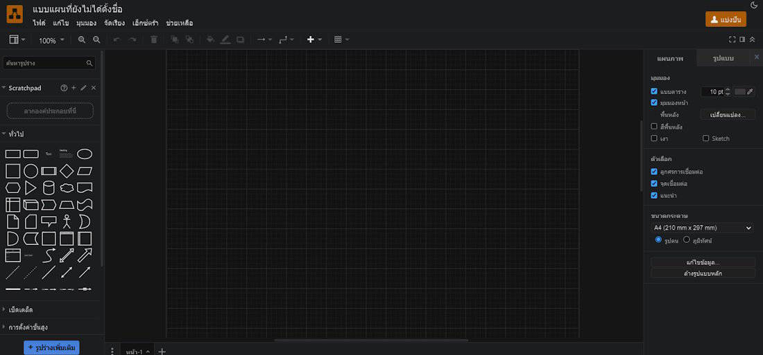 จะเข้าสู่หน้าต่างการสร้าง flowchart ต่างๆ สามารถเลือก Shape: เลือก Shape ต่างๆ ที่ต้องการมาวางบน Canvas จากนั้น เชื่อมต่อ Shape: เชื่อมต่อ Shape ต่างๆ เข้าด้วยกันเพื่อสร้างไดอะแกรม และปรับแต่งสี ขนาด และรูปแบบของ Shape และเส้นเชื่อมได้ตามต้องการ หากพอใจหรือทำต่อภายหลัง ก็สามารถบันทึกไฟล์เป็นรูปแบบที่ต้องการได้เลย