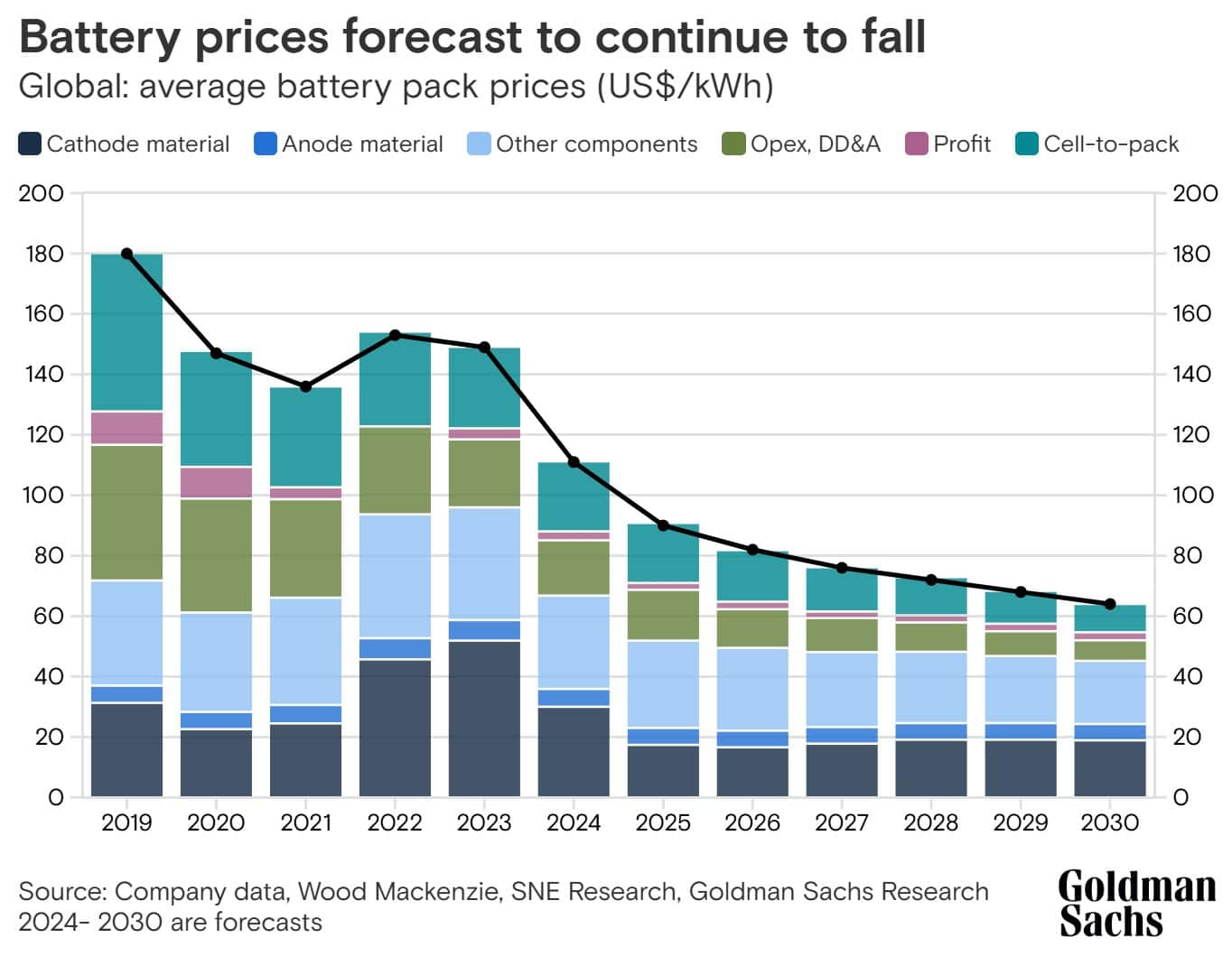 เทคโนโลยีขั้นสูงที่ทำให้ผู้ผลิตแบตเตอรี่รถยนต์ไฟฟ้าสามารถเพิ่มความหนาแน่นพลังงานได้ รวมกับราคาโลหะสีเขียวที่ลดลง จะทำให้ราคาแบตเตอรี่ต่ำกว่าที่คาดการณ์ไว้ก่อนหน้านี้ ตามรายงานของ Goldman Sachs Research