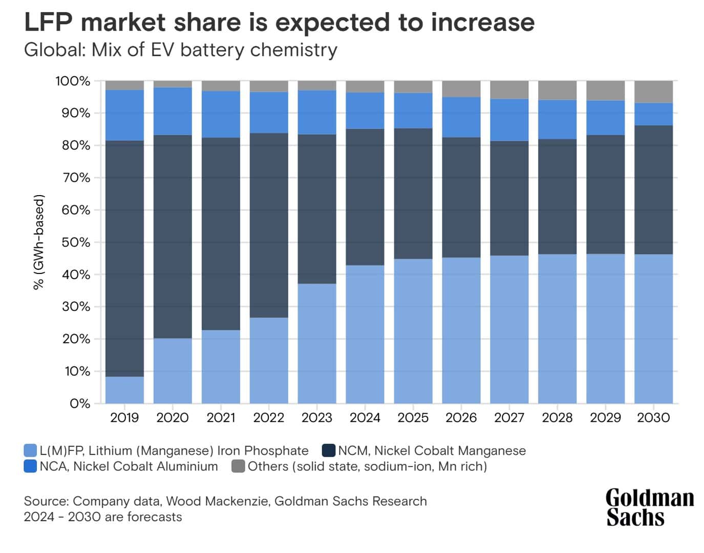 ในระหว่างนี้ แบตเตอรี่ที่ใช้ลิเธียมจะแข็งแกร่งขึ้นเรื่อยๆ ซึ่งจะทำให้แบตเตอรี่โซลิดสเตตยากที่จะเข้ามาแทนที่เทคโนโลยีที่มีอยู่ Goldman Sachs ปรับเพิ่มการคาดการณ์สำหรับแบตเตอรี่ LFP เพื่อเพิ่มส่วนแบ่งการตลาดจาก 41% เป็น 45% ในปี 2025 โดยแบตเตอรี่นิเกิลยังคงครองตลาดที่สูงกว่า