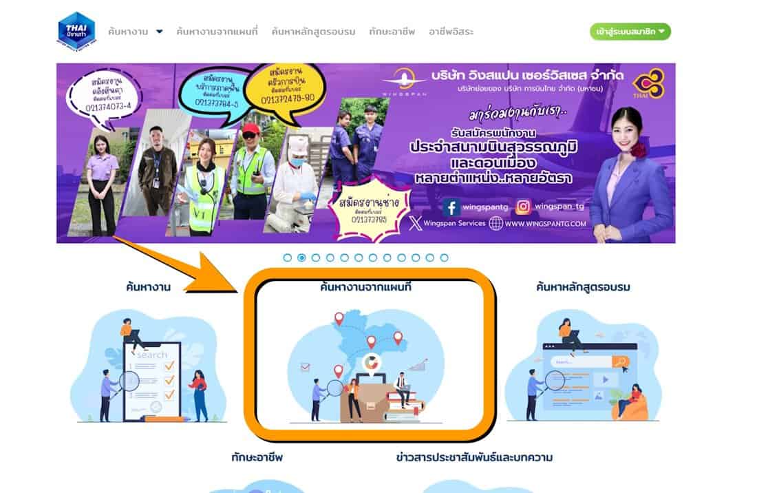 เข้าที่เว็บ https://smartjob.doe.go.th หรือ ไทยมีงานทำ.doe.go.th ได้เช่นกัน แล้วคลิกที่ ค้นหางานจากแผนที่