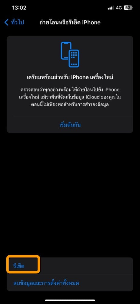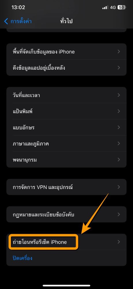เข้าไปที่ การตั้งค่า >> เลือก ทั่วไป >> เลือก ถ่ายโอนหรือรีเซ็ต iPhone