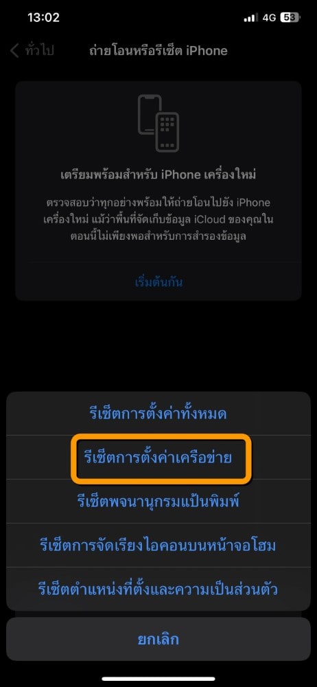 เลือก รีเซ็ตการตั้งค่าและเครือข่าย