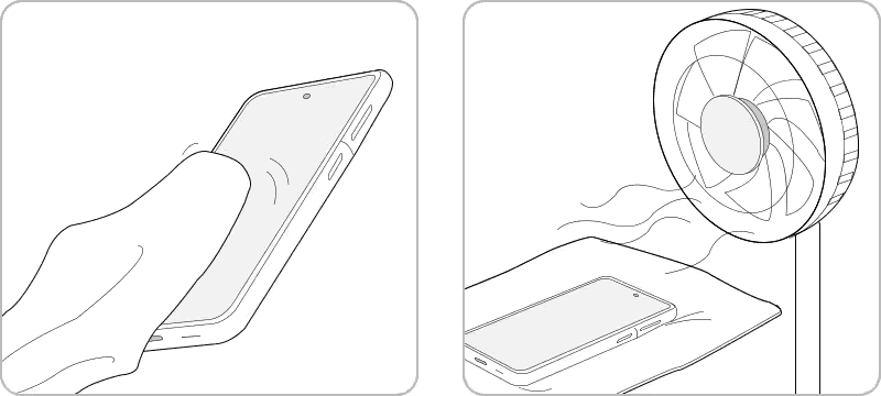 เริ่มขั้นตอนแรกคือทำให้แห้งก่อน ในกรณีนี้ ให้ถอดสายชาร์จออกจากอุปกรณ์ แล้วเช็ดด้วยผ้าแห้ง หรือเขย่าอุปกรณ์เบาๆ (5-10 ครั้ง) ไม่ควรเขย่าแรงเพราะทำให้วงจรเสียหาย โดยให้พอร์ตคว่ำลงเพื่อกำจัดความชื้น และสลัดน้ำออกไป จากนั้นวางโทรศัพท์ไว้บนผ้าในบริเวณที่มีอากาศถ่ายเทสะดวก หรือใช้พัดลมช่วยเป่าให้แห้ง ถ้าแห้งแล้วค่อยลองเสียบสายชาร์จเพื่อดูว่าชาร์จปกติหรือไม่