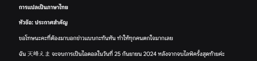 คราวนี้ลองเอาข้อความประกาศจากวงไอดอลวงนึง ซึ่งมีแต่ข้อความล้วนๆให้ Gemini แปลบ้าง