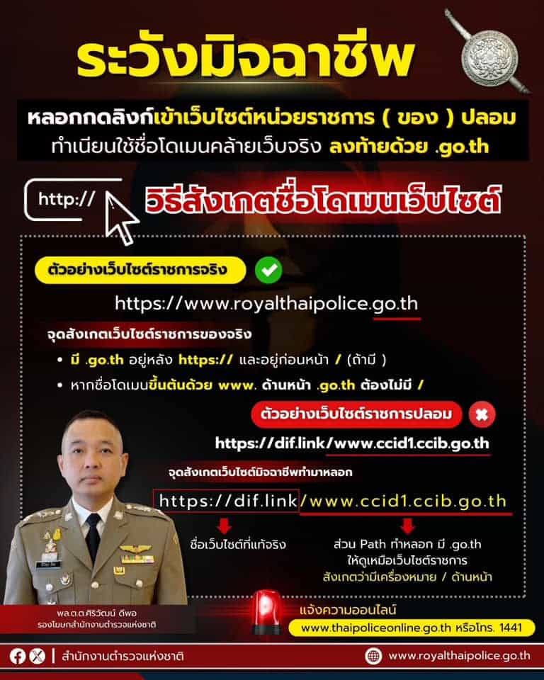 สำนักงานตำรวจแห่งชาติ จึงขอประชาสัมพันธ์แจ้งเตือนพี่น้องประชาชน ให้ระมัดระวังในการกดลิงก์ URLs ต่าง ๆ โดยให้สังเกตก่อนว่าเป็นเว็บไซต์ที่ท่านต้องการเข้าใช้งานจริงหรือไม่ และในส่วนของการสังเกตว่าเป็นโดเมน “.go.th” ของจริงหรือไม่ ให้ดูจากโดเมนของเว็บไซต์ ซึ่งจะอยู่หลัง “https://” และอยู่ก่อนหน้า “/” เช่น https://www.royalthaipolice.go.th/ เป็นต้น