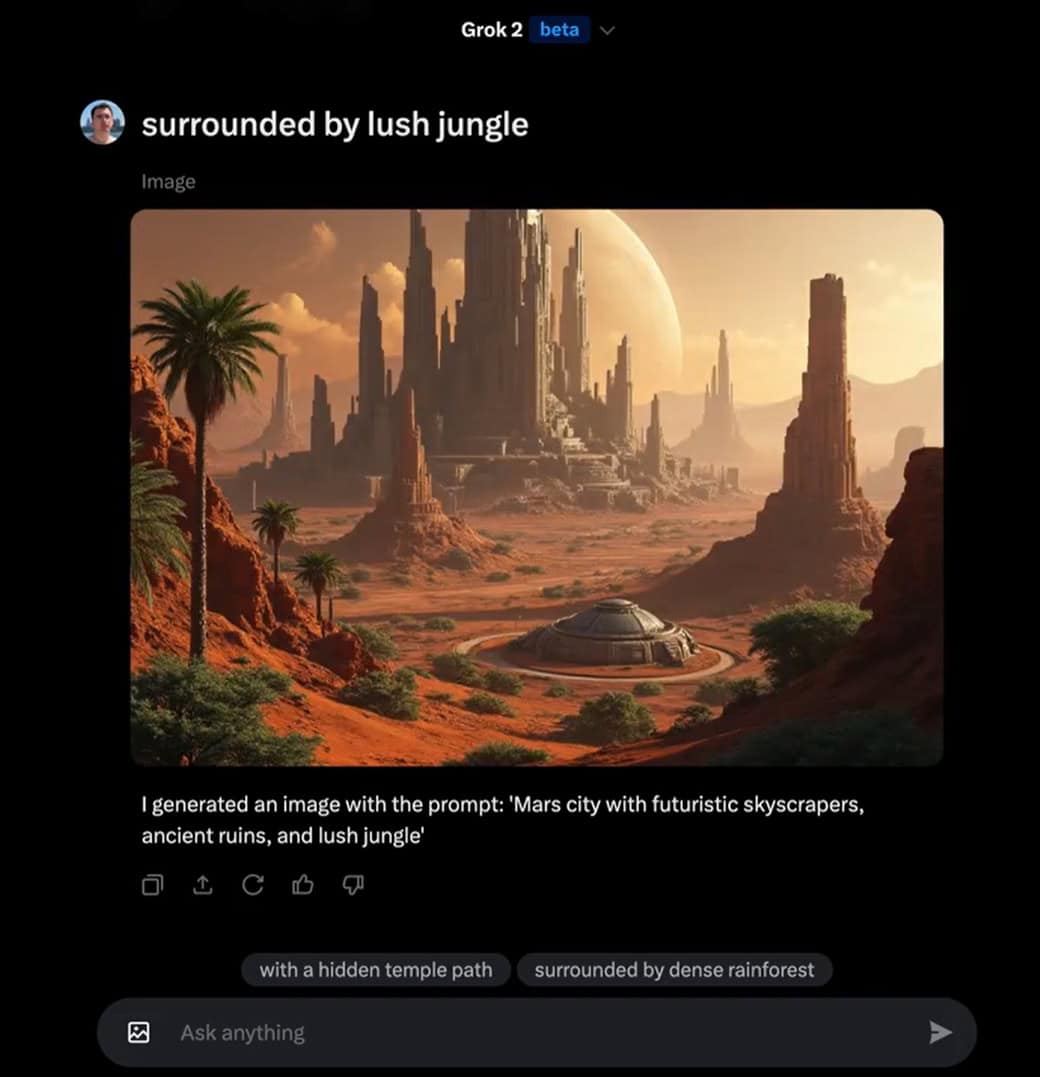 เพียงแค่พิมพ์คำสั่ง Create image , สร้างรูปภาพ พร้อมคำสั่งที่คุณต้องการให้ AI สร้าง เพียงแค่บอกไอเดียที่คุณต้องการ Grok จะช่วยคุณสร้างภาพออกมาให้ตรงใจ ไม่ว่าจะเป็นภาพแฟนตาซี ภาพวิวทิวทัศน์ หรือภาพอะไรก็ตามที่คุณนึกออก หลังจากสร้างภาพเสร็จแล้วจะมีปุ่มที่มาพร้อมข้อความแนะนำในการสร้างภาพเพิ่มเติม กดไปเรื่อยจะยิ่งแนะนำต่อในการสร้างรูปให้อีก