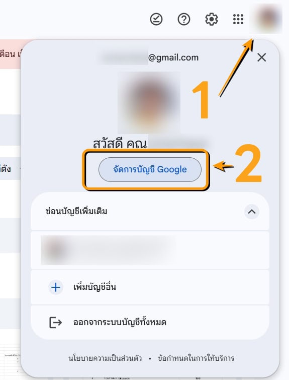 ไปที่ Google Drive (คอมพิวเตอร์) หรือเปิดแอป Drive (Android หรือ iOS) คลิกที่รูปภาพโปรไฟล์ของคุณที่มุมบนขวา และเลือก “จัดการบัญชี Google” จากเมนูแบบเลื่อนลง