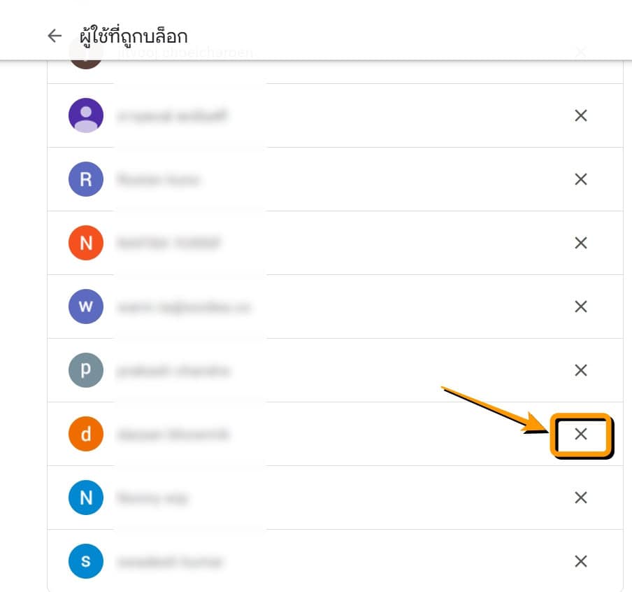 คุณจะเห็นรายชื่อบัญชีที่ถูกบล็อกในผลิตภัณฑ์ Google ของคุณ และคุณจะพบตัวเลือก X ท้ายชื่อผู้ที่ถูก คุณสามารถคลิกที่ X เพื่อยกเลิกการบล็อกบุคคลนั้นได้ทันที