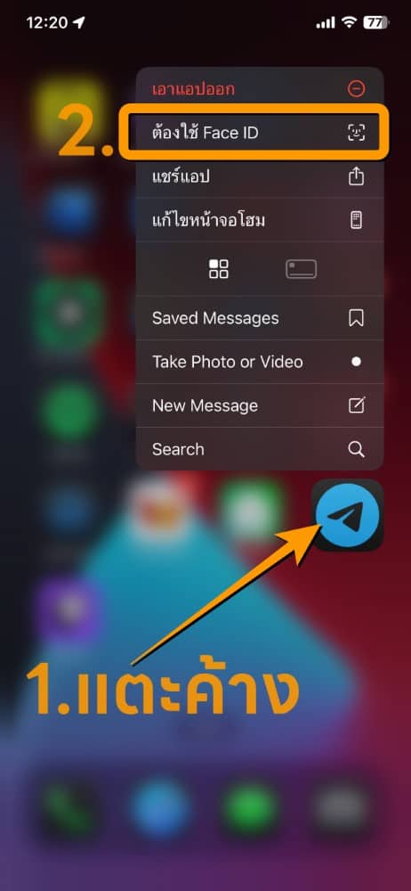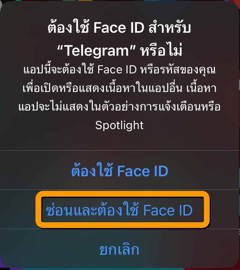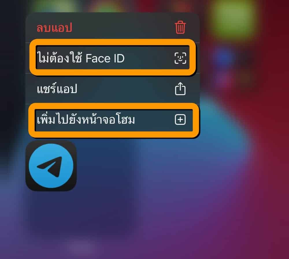 ยกตัวอย่างแอปยอดนิยมที่เป็นความลับหลายคนอย่าง Telegram หรือแอปลับอื่นๆที่คุณอยากซ่อน สามารถทำได้ดังนี้คือ แตะแอปลับของคุณค้างไว้ แล้วเลือก ต้องใช้ Face ID