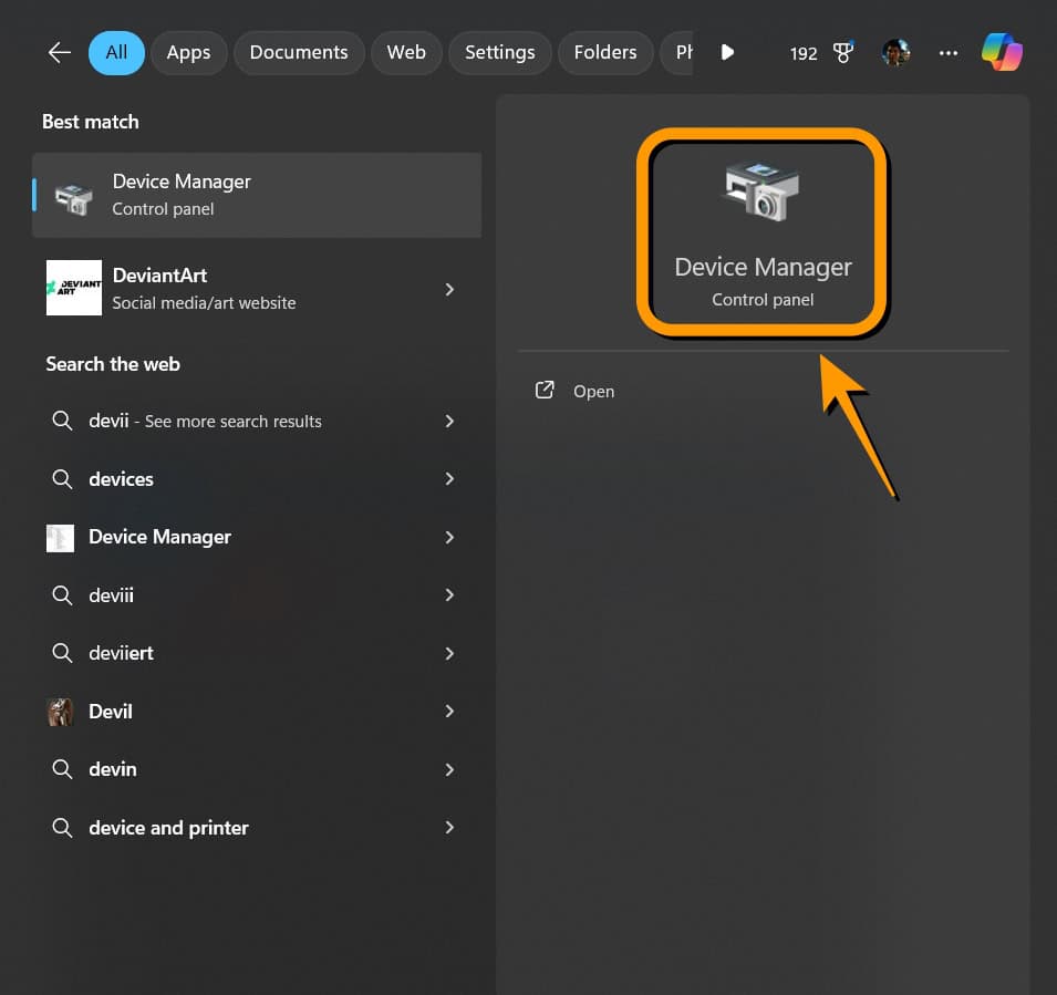 กด windows + Q เพื่อเข้าหน้า Search แล้วพิมพ์ Device Manager เลือก Device Manager