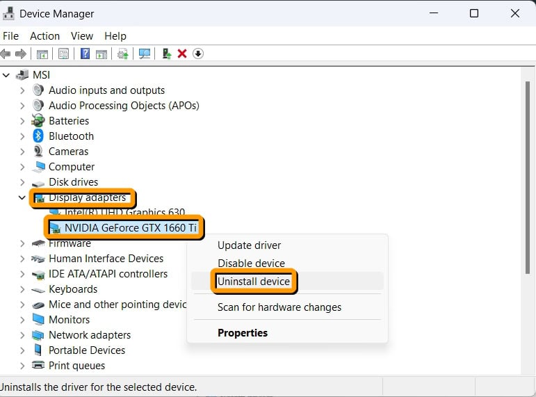 คลิกที่ Display adapters แล้วคลิกขวาที่ชื่อรุ่นการ์ดจอของคุณ แล้วเลือก Uninstall device ที่ทำแบบนี้เพื่อรีสตาร์ทการ์ดแสดงผล หลังดำเนินการตามนี้จะถอนการติดตั้งไดรเวอร์การ์ดจอ เมื่อเสร็จแล้วให้รีสตาร์ทคอมพิวเตอร์ของคุณให้เรียบร้อย ระหว่างการรีสตาร์ท Windows 11 จะติดตั้งการ์ดจอใหม่อีกครั้งโดยอัตโนมัติ นี่เป็นวิธีที่ง่ายที่สุดในการรีเซ็ตการ์ดจอใน Windows 11