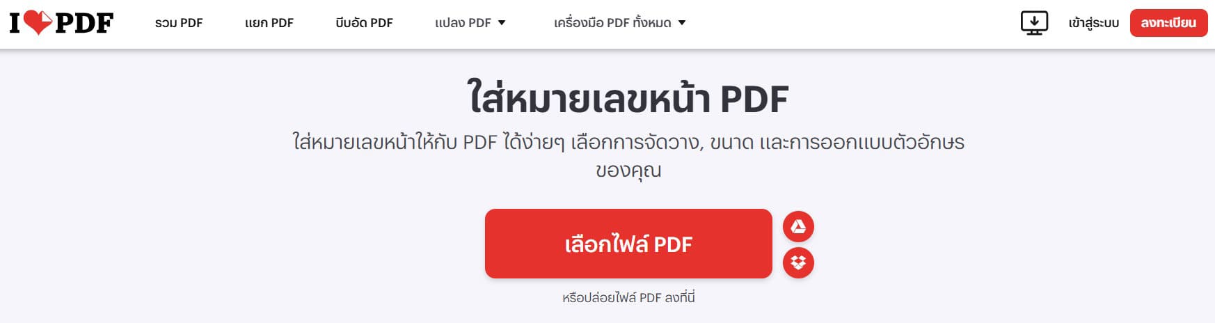 เข้าเว็บไซต์ ilovepdf.com/th/add_pdf_page_number คลิกเลือกไฟล์ (นอกจากเลือกไฟล์บนคอมพิวเตอร์ของคุณแล้ว สามารถเลือกไฟล์จาก dropbox และ google drive ของคุณได้)