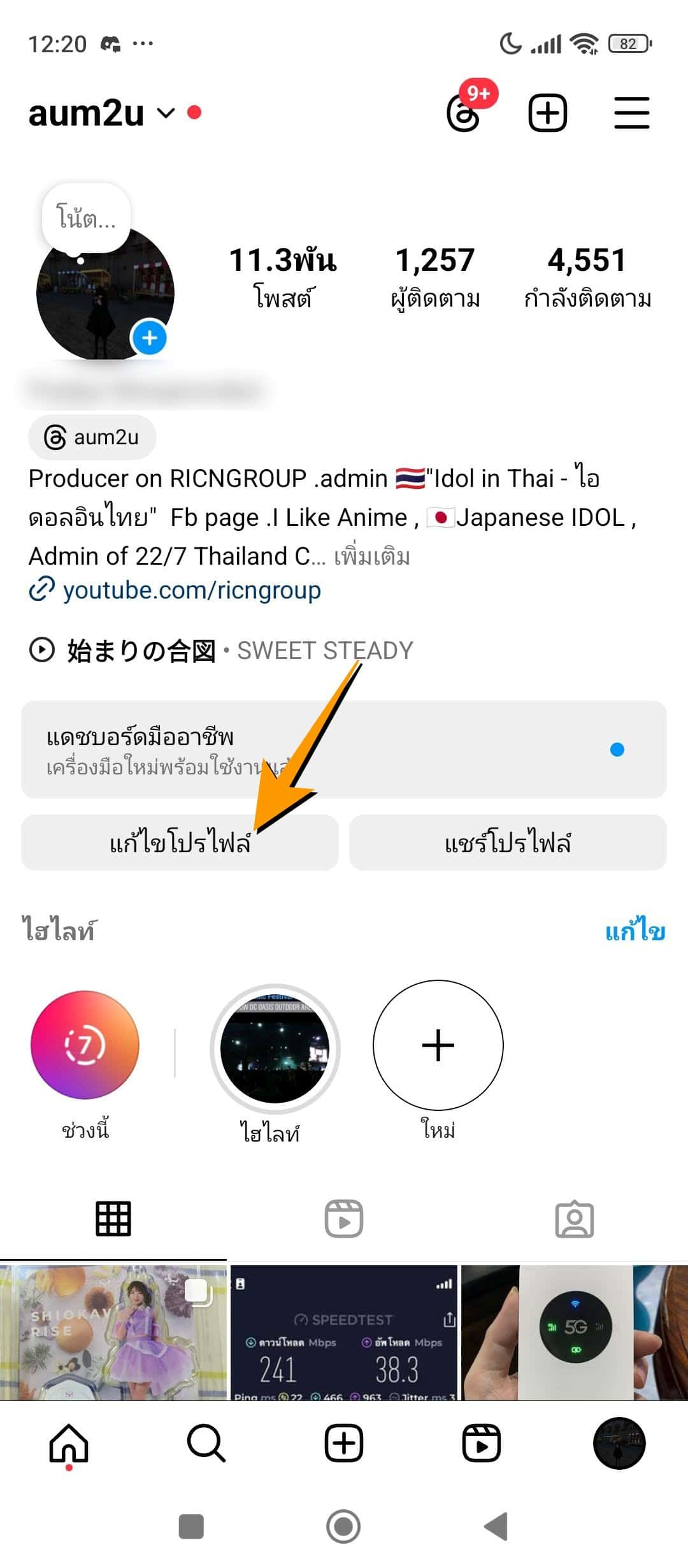 หยิบมือถือ iPhone หรือ Android เปิดแอป Instagram แล้วเข้าไปที่หน้าโปรไฟล์ของเรา แล้วเลือก แก้ไขโปรไฟล์