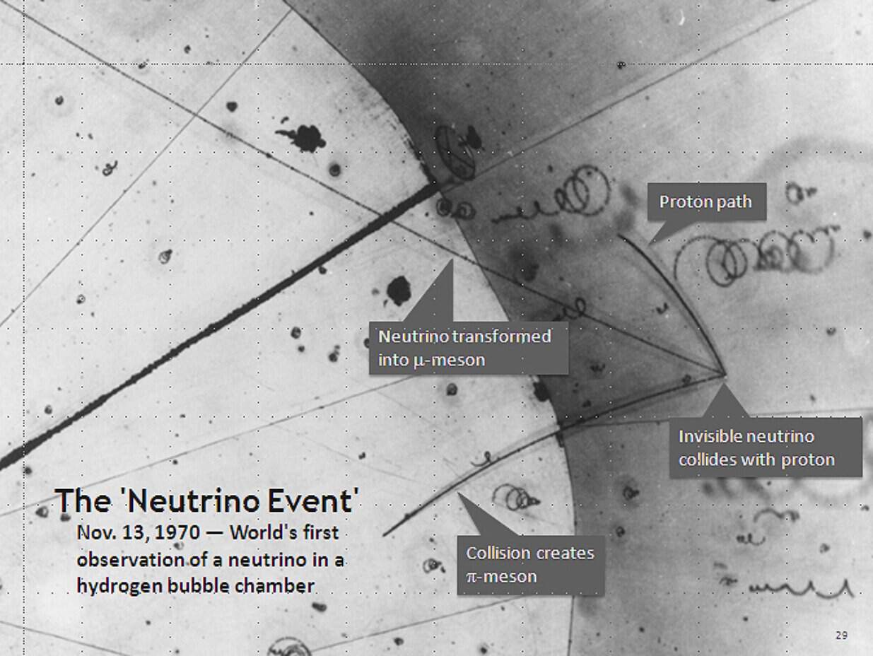 ภาพการใช้ห้องฟองไฮโดรเจนเพื่อตรวจจับนิวตริโนครั้งแรงเมื่อวันที่ 13 พฤศจิกายน 1970 ที่ห้องปฏิบัติการแห่งชาติอาร์กอนน์ นิวตริโนชนกับโปรตอนในอะตอมไฮโดรเจน