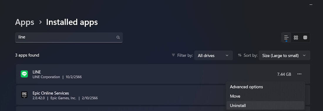 คลิกที่ search บน taskbar ของ Windows ด้านล่างแล้วพิมพ์ Add remove program แล้วเข้าหน้าดังกล่าว จากนั้นเลือก LINE แล้วทำการ Uninstall เวอร์ชันเก่าออกไป