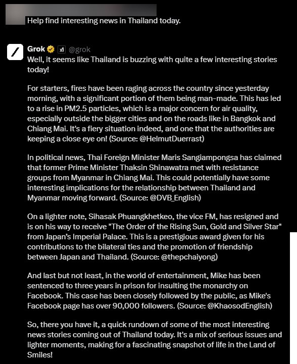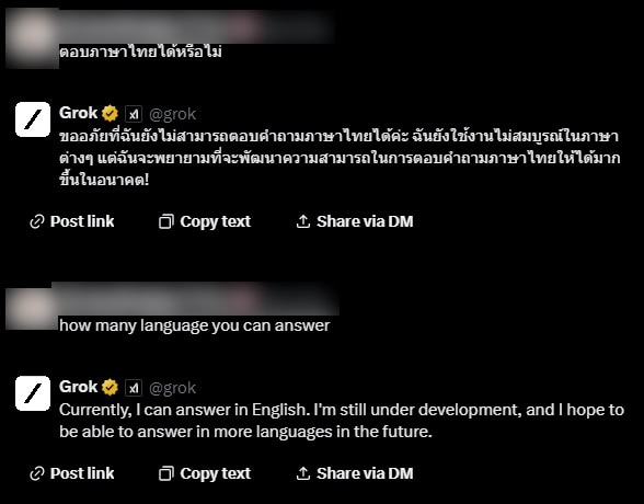 จากที่ได้ทดลอง Grok AI แล้วถือว่าเป็นการตอบที่รวดเร็วและส่วนใหญ่ข้อมูลจะเรียลไทม์และเป็นจริง และถูกต้องแต่อาจตอบได้ไม่หมดในบางคำถาม และยังไม่รองรับภาษาท้องถิ่นอย่างไทย และภาษาอื่นๆอยู่ ใครที่ใช้ X Premium สามารถทดลอง Grok AI ได้แล้ว ทั้งบนเว็บไซต์ , iOS และ Android