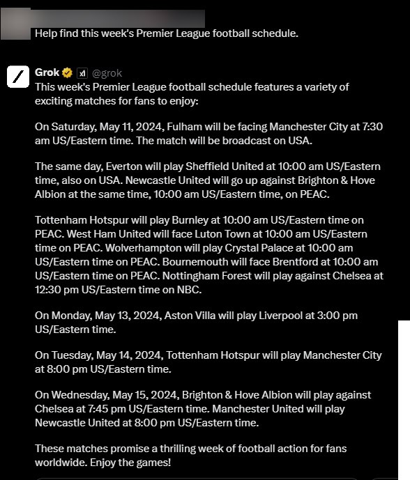 คราวนี้ลองถามโปรแกรมพรีเมียร์ลีกสัปดาห์นี้ Grok AI ก็ตอบอย่างไวและยาวและเป็นจริง