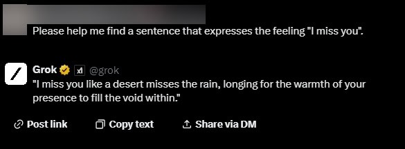 ขึ้นชื่อว่า Grok AI มีอารมณ์ขันเลยช่วยแต่งประโยคบอกคิดถึง ก็ตอบได้แบบนี้เลย