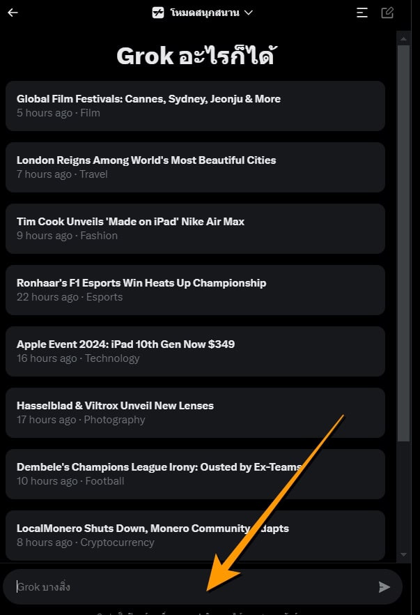 หน้าแรกก็ประมาณนี้ สามารถคลิกหัวข้อสนใจที่ต้องการดูว่า Grok AI ตอบอย่างไร หรือพิมพ์คำสั่ง Prompt ถามเองตามที่คุณต้องการได้เลย