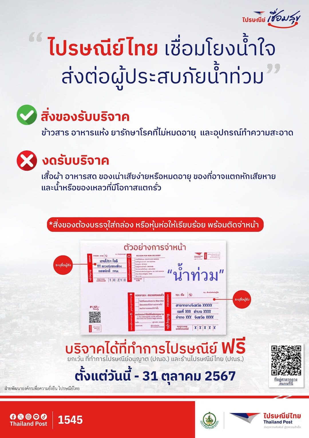 ทั้งนี้ ได้เปิดรับบริจาคสิ่งของที่จำเป็นผ่านเคาน์เตอร์ให้บริการและบริการ Pick up Service รับฝากสิ่งของนอกสถานที่สำหรับหน่วยงานที่มีของเป็นจำนวนมาก ขนส่งด้วยบริการส่งด่วน EMS โดยไม่มีค่าใช้จ่าย ให้บริการแล้วตั้งแต่วันนี้ ถึงวันที่ 31 ตุลาคม 2567