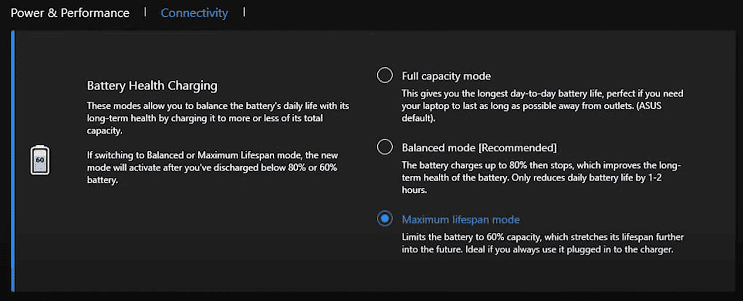 แต่คอมบางรุ่นเลยออกมาให้เราสามารถตั้งค่าได้ว่าจะชาร์จสูงสุดแค่ 80% เท่านั้นทำให้ต่อให้เราชาร์จไปใช้ไป แบตก็จะถูกชาร์จไม่เกิน 80% อยู่ดี