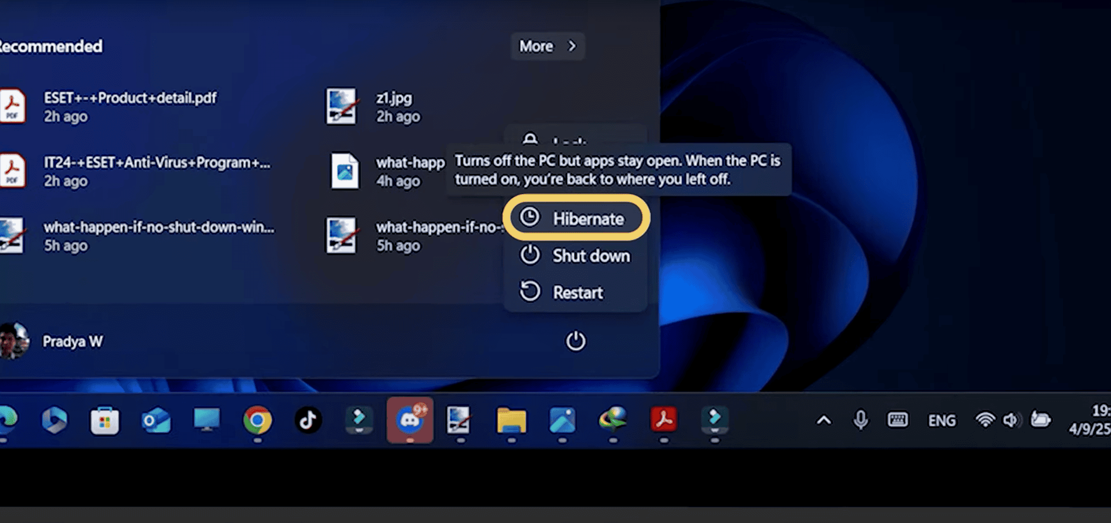 แล้วหลังจากนั้นเวลาที่เราไปที่ Start และ Power ก็จะมีโหมด Hibernate มาให้เลือก