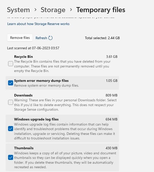 เลือก Temporary Files แล้วเลือกติ๊กถูกตามรูป แล้วคลิกที่ Remove Files แค่นี้ก็ลบไฟล์ที่ไม่จำเป็นออกไปและได้พื้นที่ว่างเพิ่มแล้ว