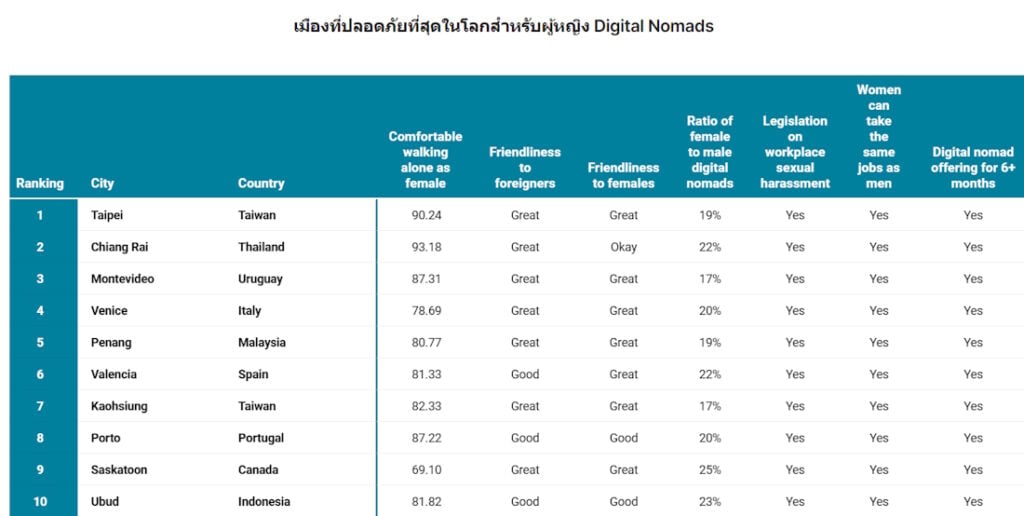 สรุปข้อมูล 10 อันดับเมืองปลอดภัยสำหรับ Digital Nomad สำหรับผู้หญิง