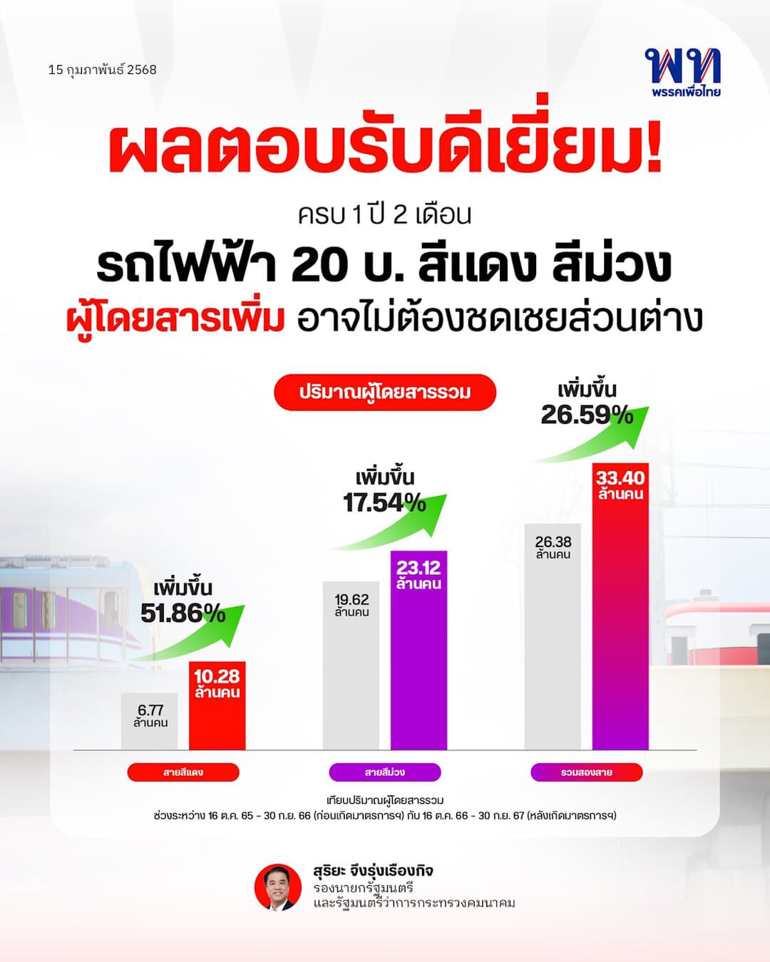 นายสุริยะ กล่าวอีกว่า จากแนวโน้มปริมาณผู้โดยสารที่ตอบรับนโยบายค่ารถไฟฟ้า 20 บาทตลอดสาย ถือว่าเป็นสัญญาณที่ดีที่รัฐบาล และกระทรวงคมนาคมได้ช่วยลดภาระค่าครองชีพในการเดินทางให้กับพี่น้องประชาชน อีกทั้งยังจูงใจให้หันมาใช้ระบบขนส่งสาธารณะมากขึ้น ลดการใช้รถยนต์ส่วนบุคคล ซึ่งเป็นอีก 1 ปัจจัยในการช่วยลดปัญหาฝุ่นละออง PM2.5 และสร้างโอกาสในการเดินทางอย่างเท่าเทียมของคนทุกกลุ่มด้วย