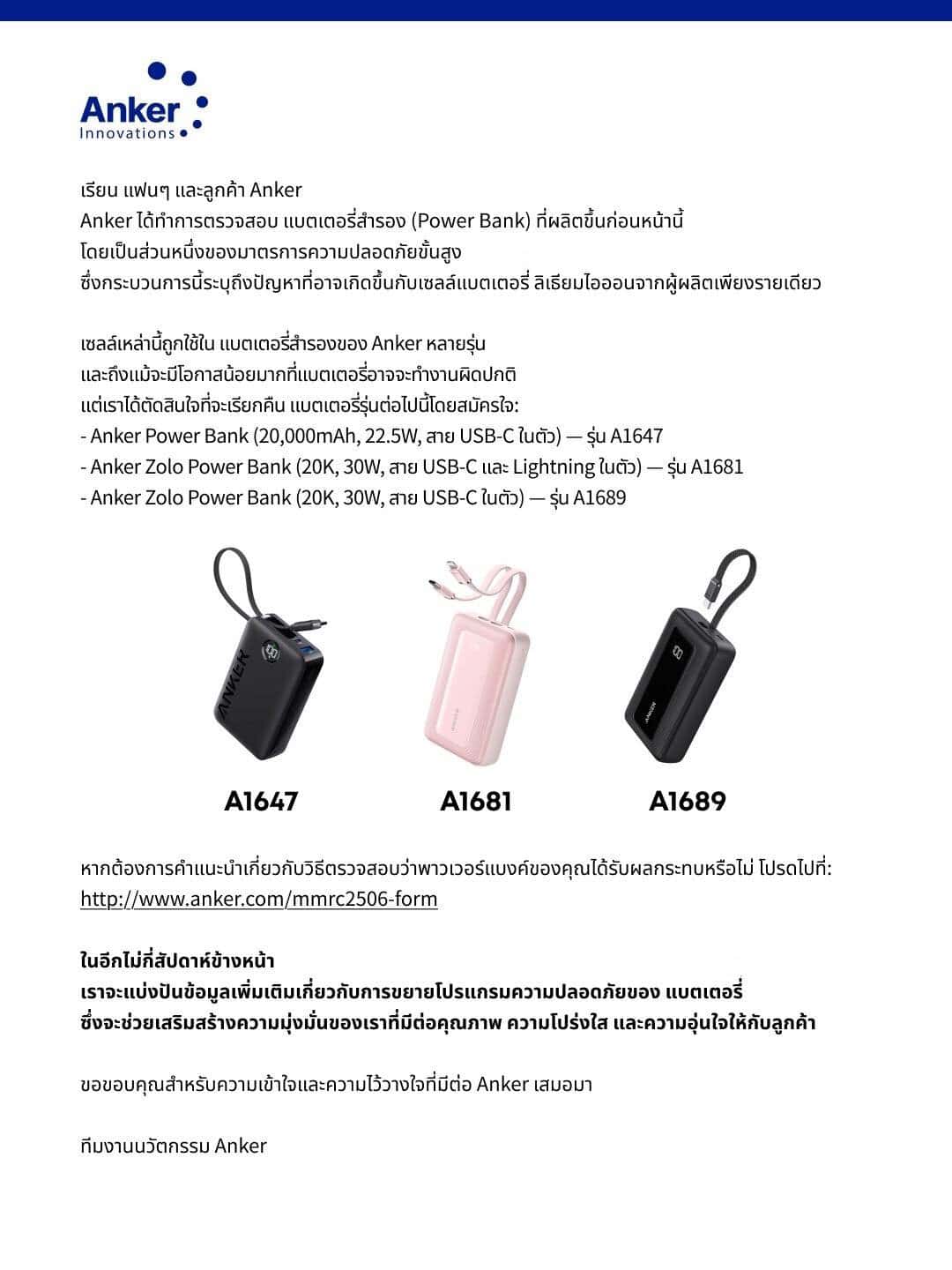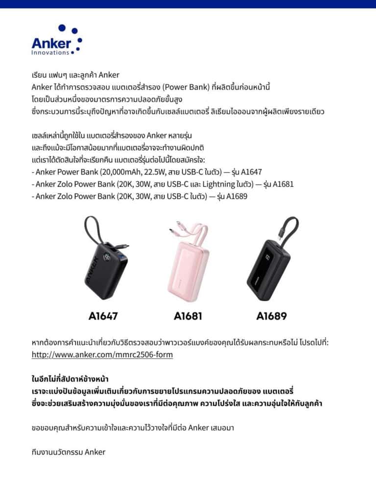 Anker เรียกคืน Powerbank ในไทย 3 รุ่น เช่่นเดียวกับรุ่นที่ถูกประกาศห้ามบินในประเทศจีนด้วย โดย Anker ชี้แจงว่าได้ทำการตรวจสอบ แบตเตอรี่สำรอง (Power Bank) ที่ผลิตขึ้นโดย Anker ก่อนหน้านี้โดยเป็นส่วนหนึ่งของมาตรการความปลอดภัยขั้นสูง ซึ่งกระบวนการนี้ระบุถึงปัญหาที่อาจเกิดขึ้นกับเซลล์แบตเตอรี่ ลิเธียมไอออนจากผู้ผลิตเพียงรายเดียว