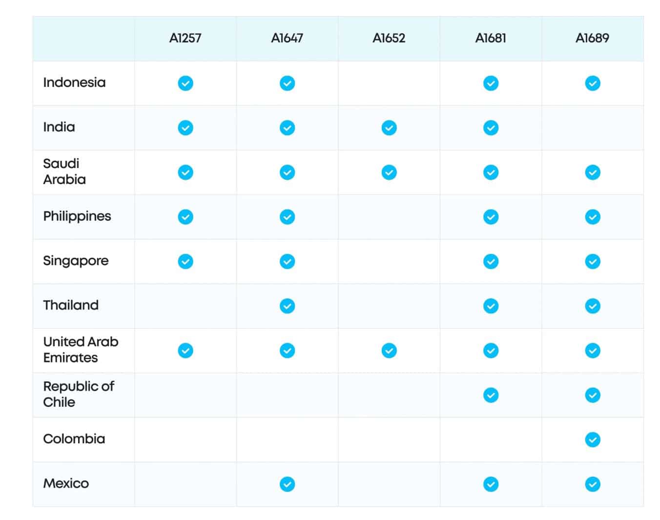 หากตรงกับหมายเลขรุ่นใดรุ่นหนึ่งต่อไปนี้: A1647, A1681 หรือ A1689 รวมถึงรุ่นอื่นที่มีจำหน่ายในประเทศอื่นๆด้วยตามภาพด้านล่าง หากพบแนะนำห้ามใช้และตรวจสอบด้วยว่าเข้าข่ายได้รับผลกระทบหรือไม่ หากใช่ให้ดำเนินการตามขั้นตอนที่ 2