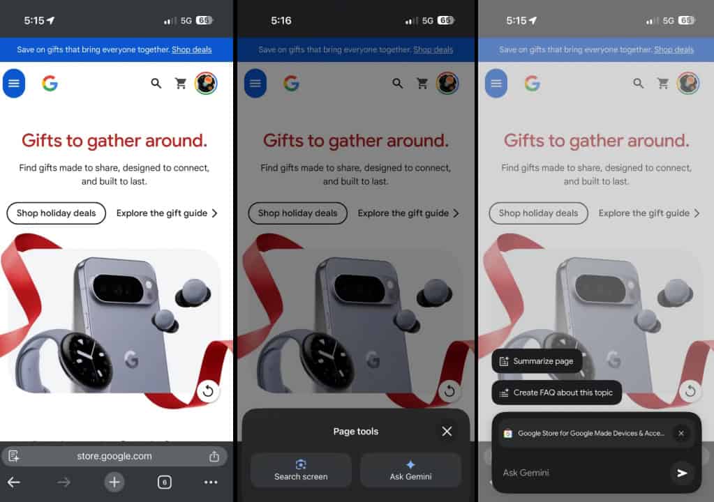 เมื่อแตะที่ไอคอนดังกล่าว จะมีหน้าต่าง “เครื่องมือหน้าเว็บ” (Page tools) เลื่อนขึ้นมา โดยมีตัวเลือกหลักคือ “ค้นหาจากหน้าจอ” (Search Screen) และ “ถาม Gemini” (Ask Gemini)