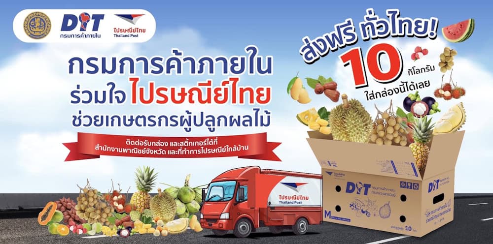 กรมการค้าภายใน ร่วมกับบริษัท ไปรษณีย์ไทย จำกัด ผนึกกำลังช่วยเกษตรกรไทย แจกกล่องและตะกร้าบรรจุผลไม้กว่า 238,000 ชิ้น พร้อมส่งฟรีทั่วประเทศ เพื่อเร่งกระจายผลไม้ไทย กว่า 3,000 ตัน ลดต้นทุนและแก้ปัญหาผลไม้ตกค้างจากสถานการณ์ด่านปิดประเทศเพื่อนบ้าน สร้างโอกาสขายผ่านระบบขนส่งที่ครอบคลุมและรวดเร็ว