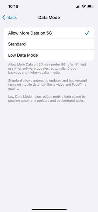โหมดข้อมูลต่ำ เมื่อเปิดใช้งาน การทำงานเบื้องหลังหลายอย่างจะถูกจำกัด คุณควรปิดใช้งานฟีเจอร์นี้เพื่อแก้ไขปัญหาฮอตสปอตของ iPhone ปิดอัตโนมัติ ส่วนใหญ่จะเกิดขึ้นกับไอโฟนที่รองรับ 5G