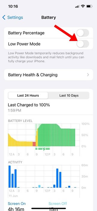ไปที่ Setting >> เลือก Battery >> แล้วทำการปิดที่ Low Power Mode.