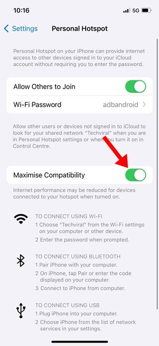 3. ทำการเปิด Maximize Compatibility โหมดเข้ากันได้สูงสุด บน Personal Hotspot