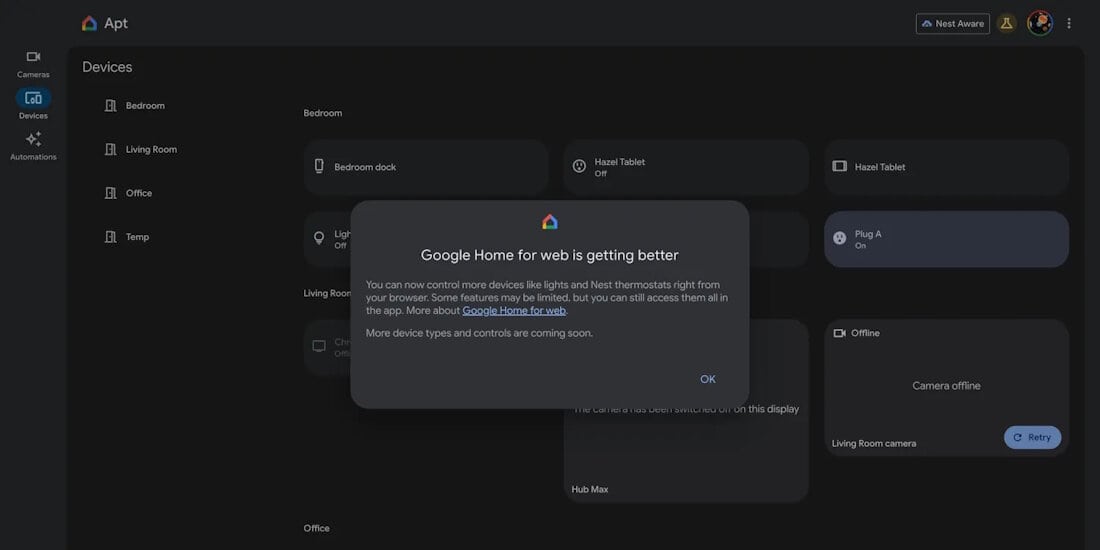 อย่างไรก็ตาม อุปกรณ์สื่อ (เช่น ลำโพง หน้าจอ และ Chromecast) อาจปรากฏเป็นไทล์ แต่ยังไม่สามารถควบคุมสื่อผ่านเว็บได้ — ส่วนการควบคุมกล้องยังใช้งานได้ตามปกติ