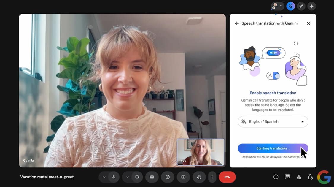 เมื่อเพื่อนร่วมงานเปิดการแปลคำพูดของ Gemini แล้ว Meet จะเริ่มพากย์เสียงทับสิ่งที่พวกเขากำลังพูดโดยใช้การแปลภาษาอังกฤษที่สร้างโดย AI ซึ่งรวมถึงการออกเสียงทั้งหมด