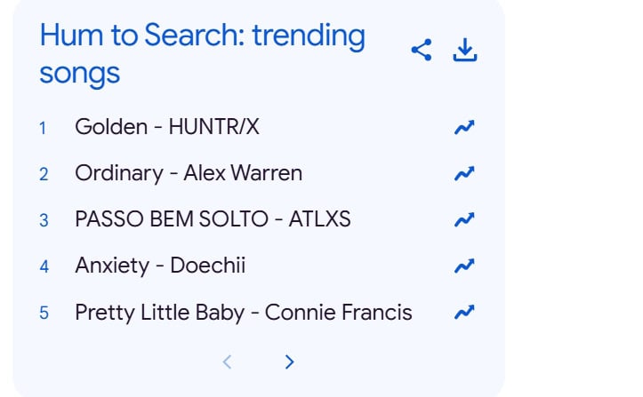และปิดท้ายด้วยเพลงที่ฮัมแล้วเจอเพลงนั้นมากที่สุดในปี 2025 ได้แก่เพลง Golden – HUNTR/X แสดงว่าน่าจะชอบลักษณะเพลงแบบนี้แต่ไม่รู้ว่าเป็นเพลงอะไร เลยหาจาก Google Hum to Search แล้วเจอเพลงดังกล่าว