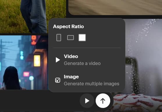 คลิกที่สามเหลี่ยม Play เพื่อเลือกรูปแบบว่าจะเอาแบบสร้างภาพ หรือสร้างวิดีโอ ให้เลือกที่ Video และเลือก Ratio ตามที่คุณต้องการว่าจะเป็นแนวตั้ง แนวนอน หรืิอ สี่เหลี่ยมจตุรัส หากเสร็จแล้วคลิก ลูกศรขึ้น หรือกด Enter เพื่อรันคำสั่ง Prompt สร้างวิดีโอได้เลย
