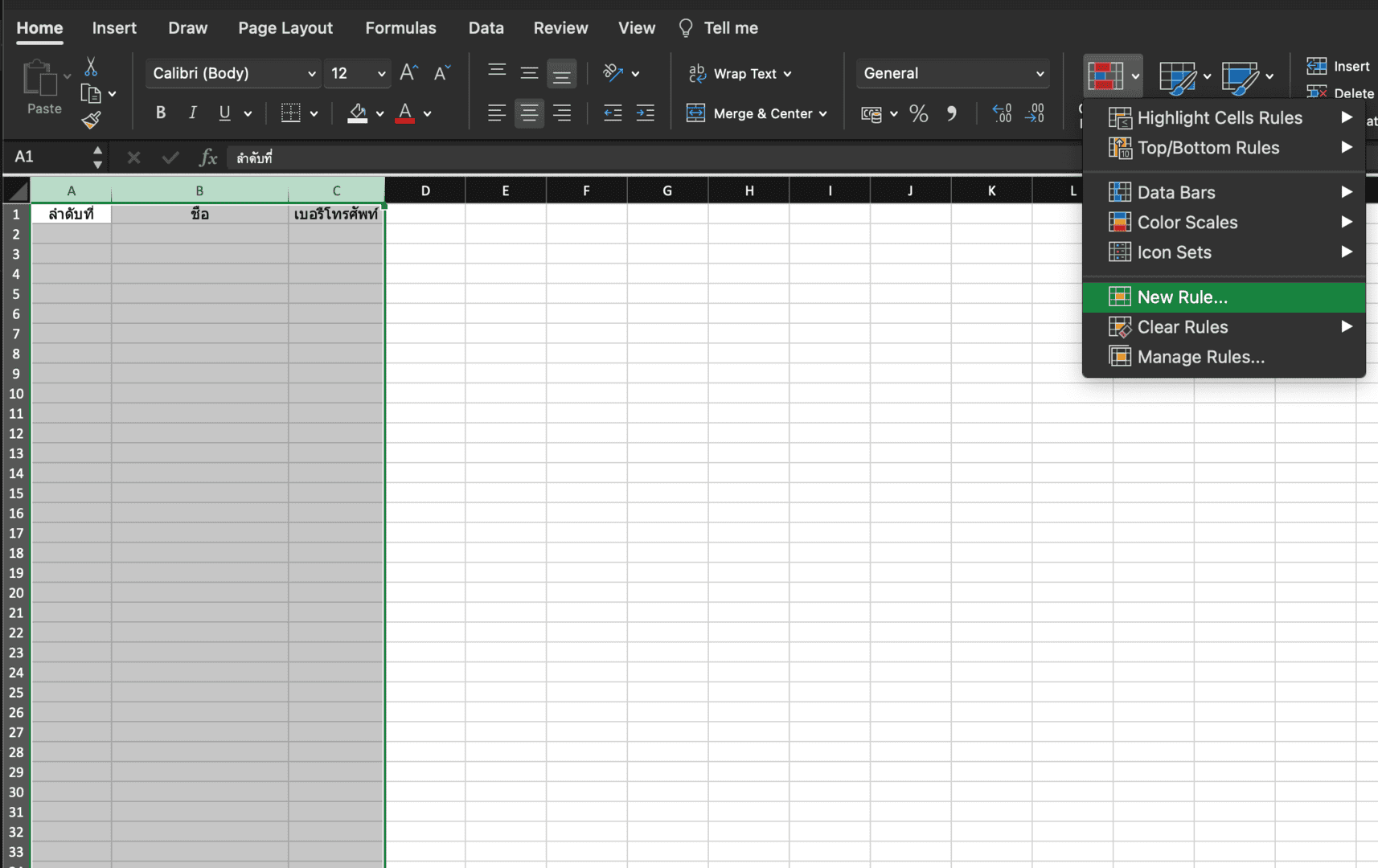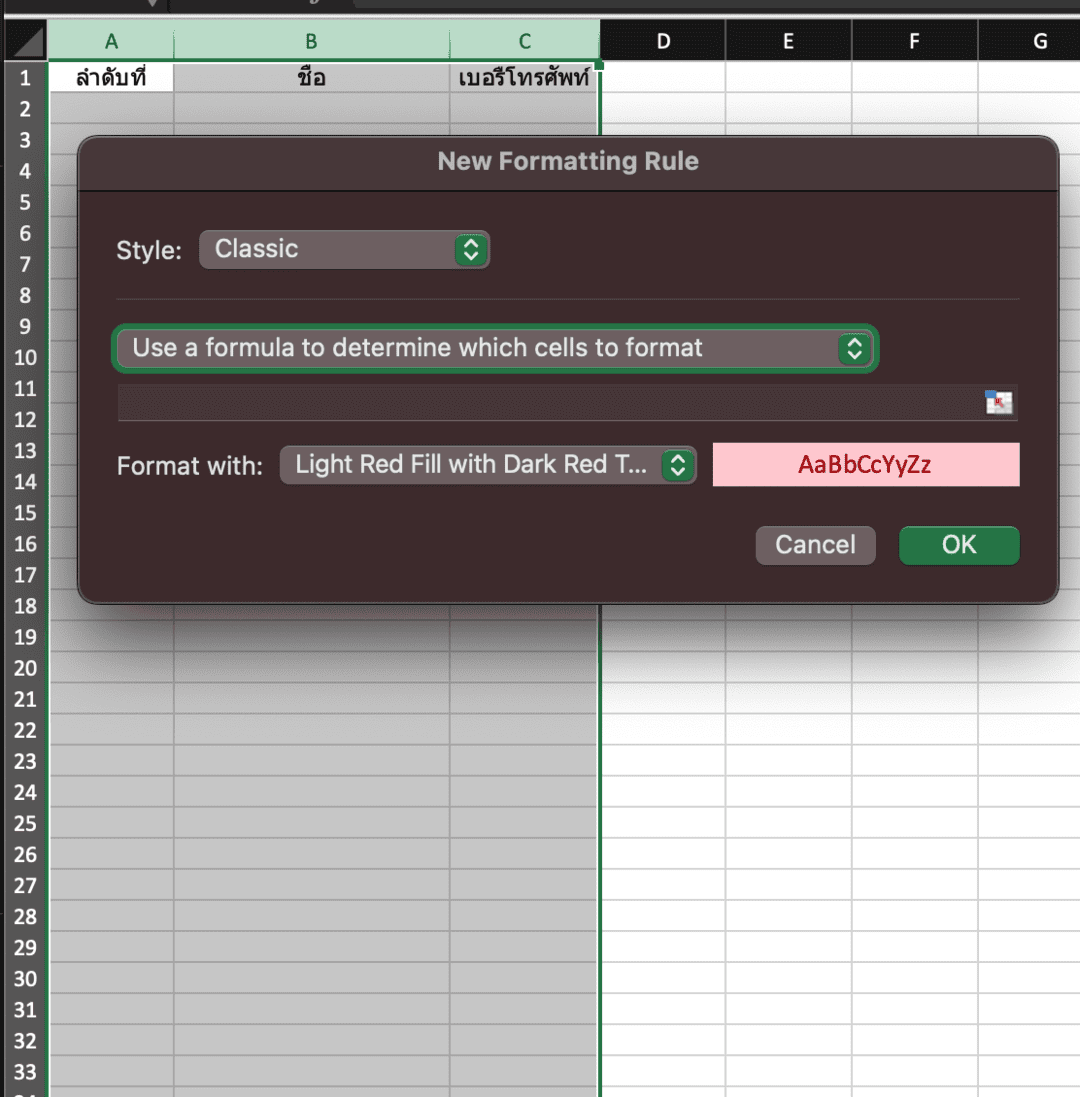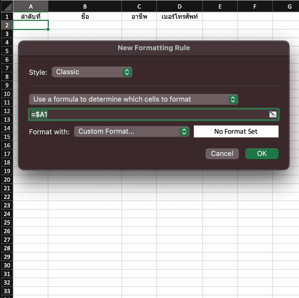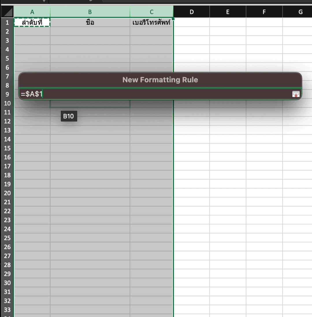 - เลือกที่เซลล์ที่อยู่แรกสุด เพื่อให้ปรากฎค่าในช่อง “New Formatting Rule” เช่น =$A$1