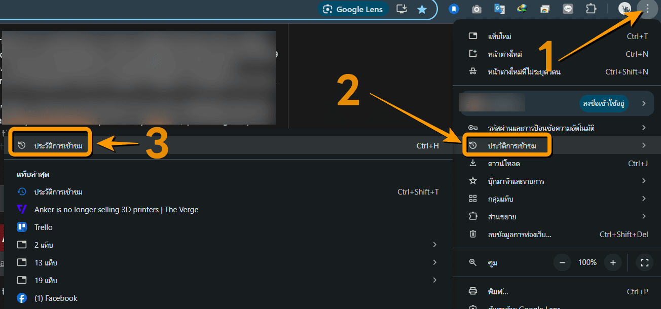 เปิด Google Chrome คลิกเมนู 3 จุดมุมขวาบน >> เลือก “ประวัติการเข้าชม” (History) >>