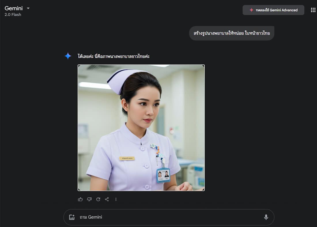 สร้างรูปพยาบาลชาวไทย ก็็พิมพ์ สร้างรูปภาพนางพยาบาลชาวไทยบน gemini.google.com ได้เลย
