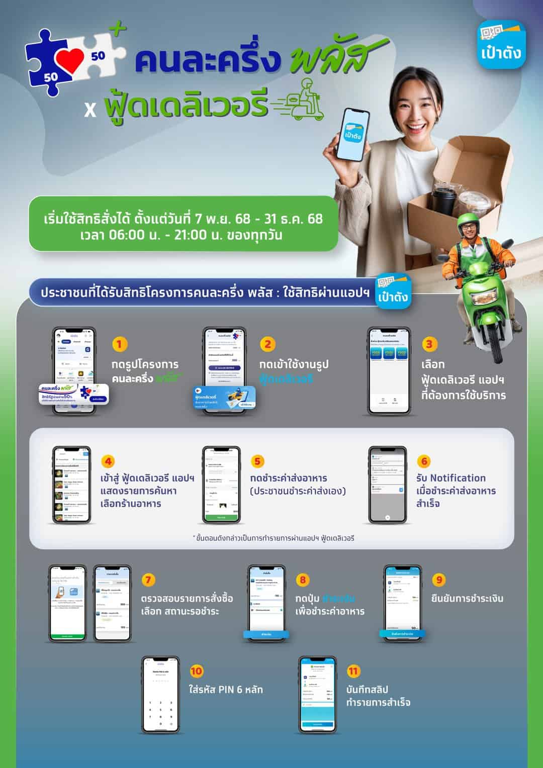 นอกจากนี้ยังสามารถใช้สิทธิ์คนละครึ่งเดลิเวอร์รี่ได้ด้วย ซึ่งจะเริ่มใช้ได้ตั้งแต่ 7 พฤศจิกายน 2568 จนถึงสิ้นสุดโครงการคือ 31 ธันวาคม 2568 ตั้งแต่ 6.00-21.00น.