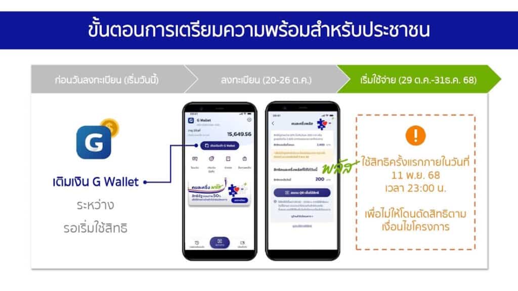 ในส่วนร้านค้าใหม่ที่จะร่วมขายในโครงการคนละครึ่ง จะเปิดลงทะเบียนตั้งแต่ 15 ตุลาคม – 19 ธันวาคม 2568 ส่วนร้านค้าเก่าที่เคยเข้าร่วมคนละครึ่งเฟส 5 แล้ว ไม่ต้องลงทะเบียนใหม่ เพียงแค่อัปเดตแอปเป๋าตังและถุงเงิน ให้เป็นเวอร์ชันล่าสุด