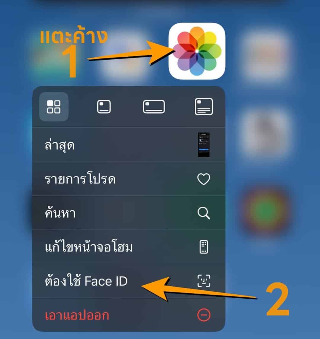 แตะที่ Apple Photos (รูปภาพ) บนหน้าจอ Home Screen ค้างไว้ แล้วเลือก ต้องใช้ Face ID