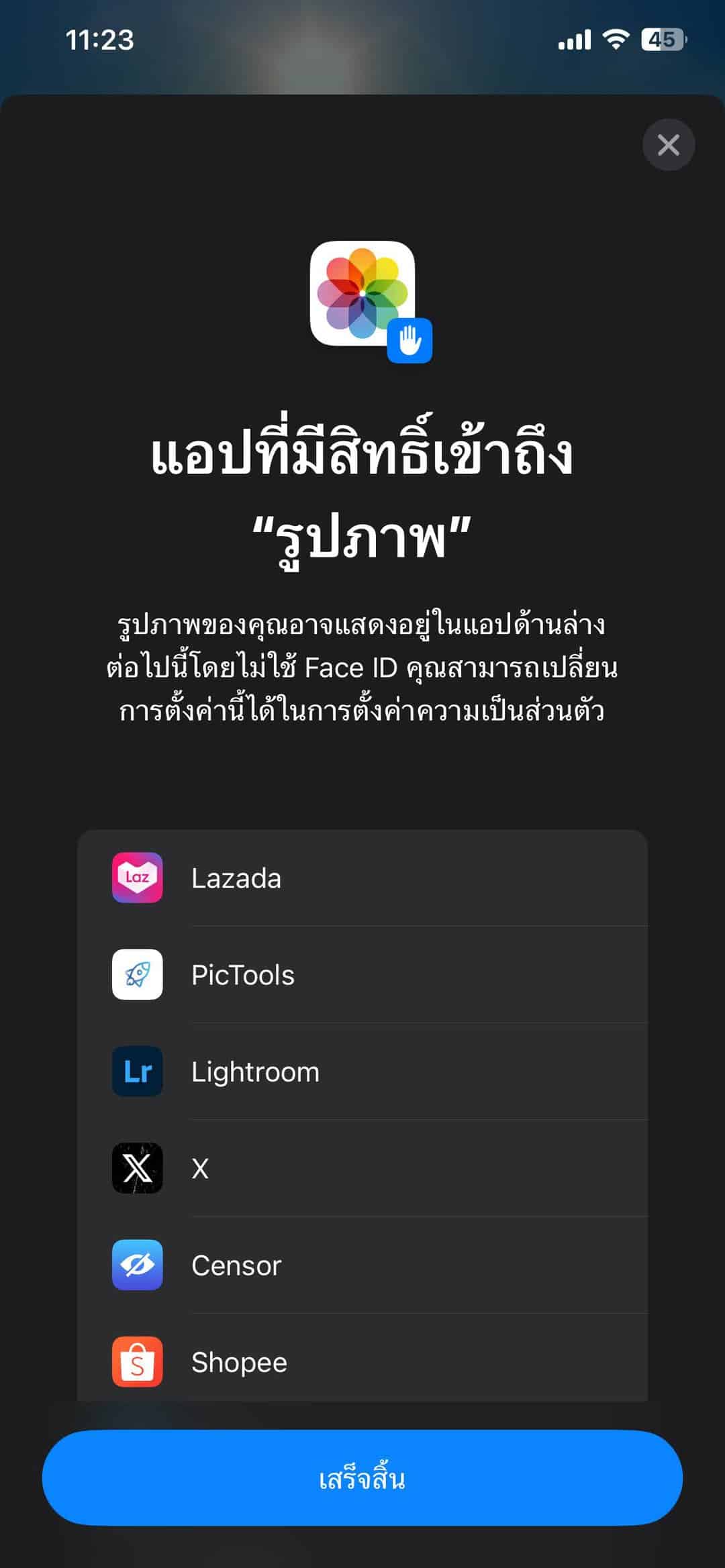 อาจมีข้อความแจ้งปรากฏขึ้นเพื่อแสดงแอปที่มีสิทธิ์เข้าถึงแอปรูปภาพของคุณอยู่แล้ว สำหรับแอปเหล่านี้ คุณอาจเข้าถึงรูปภาพได้โดยไม่ต้องใช้ Face ID