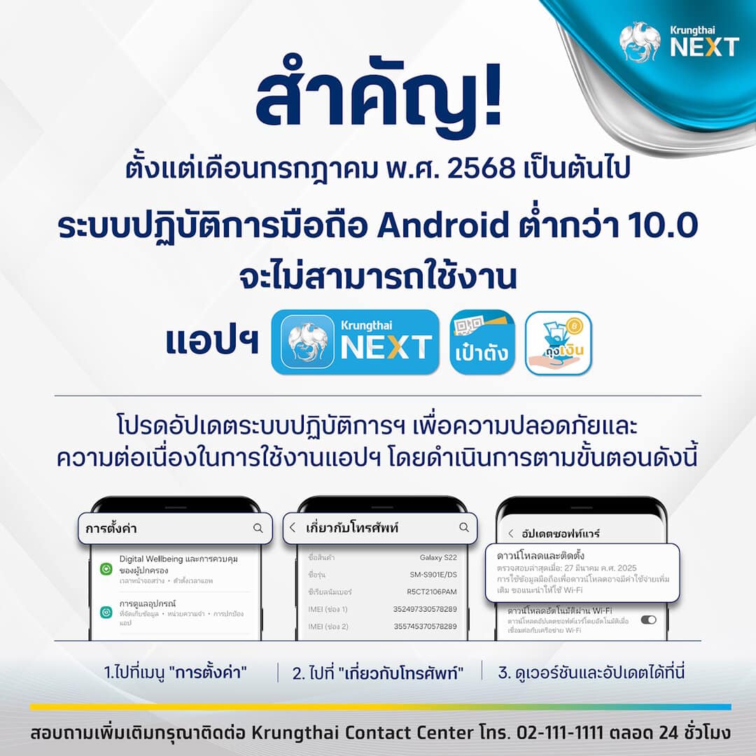 โดยผู้ใช้งานมือถือ Android รุ่่นเก่าที่ใช้ระบบปฏิบัติการต่ำกว่า android 10.0 จะไม่สามารถใช้งานแอปพลิเคชัน Krungthai NEXT, เป๋าตัง และถุงเงินได้ เพื่อเพิ่มความปลอดภัยในการใช้งานและรองรับการให้บริการอย่างมีประสิทธิภาพ ผู้ใช้งานควรอัปเดตระบบปฏิบัติการ Android ให้เป็นเวอร์ชันล่าสุดก่อนถึงกำหนด